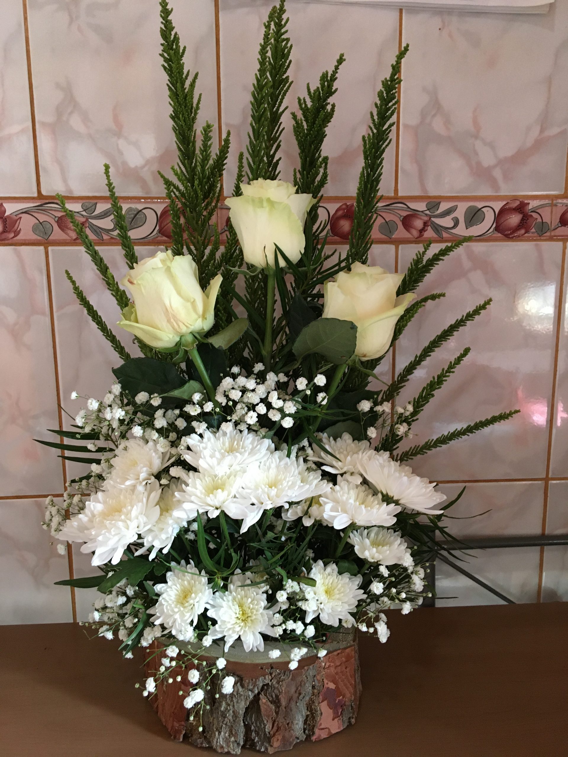 Arreglo 3 rosas más maule en base de madera rústica