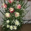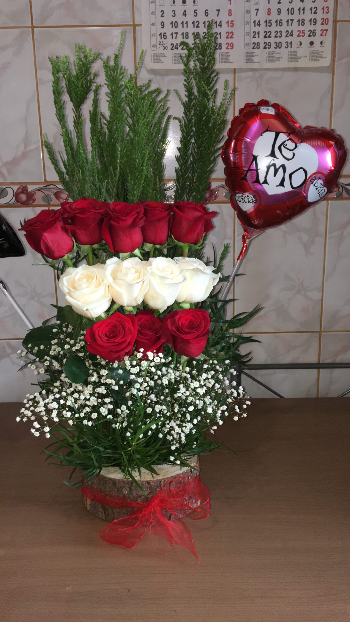 12 rosas más globo chico en base de madera rústica